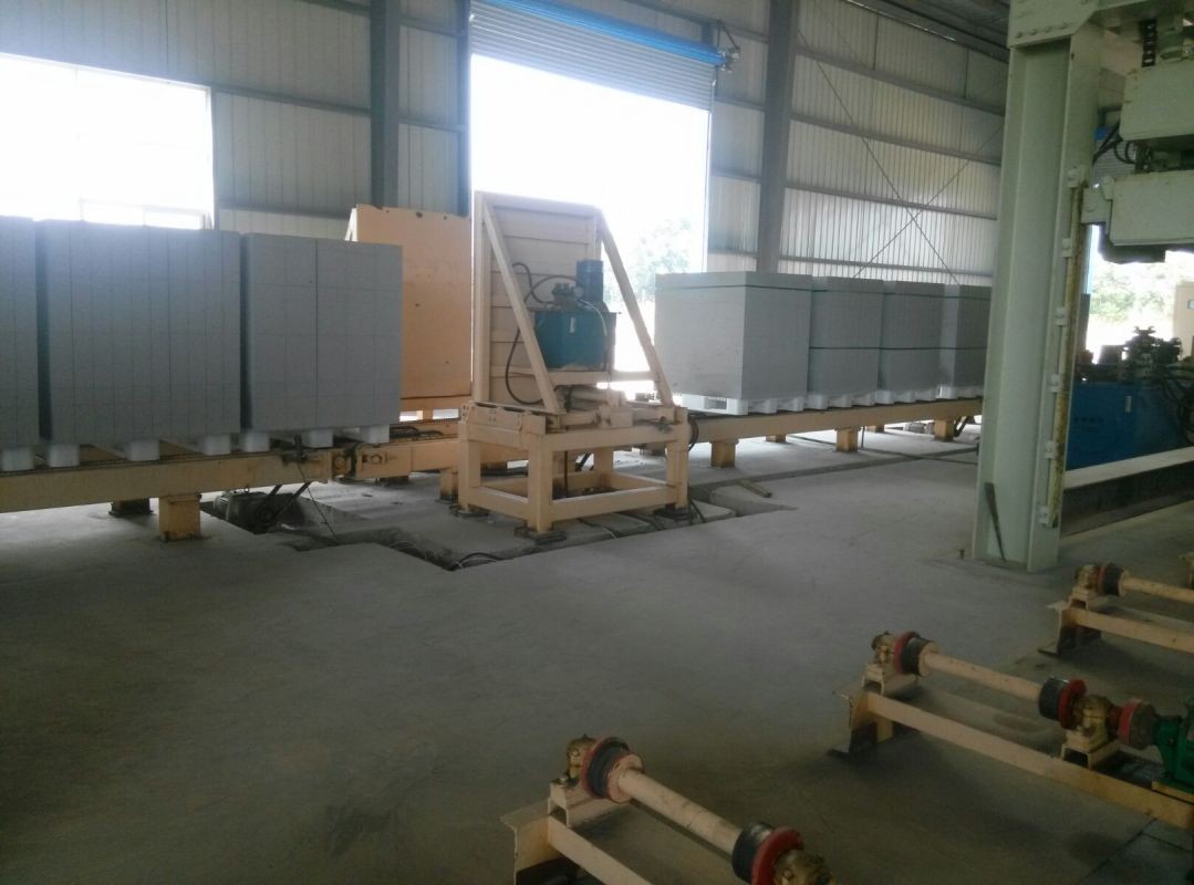 浇注后模具用输送链推入初养室进行发气初凝,室温为50~70℃,初养时间为1.5-2小时(根据地理有利条件,可免去此工艺),初养后用负压吊具将模框及坯体一同吊到预先放好釜底板的切割台上.脱去模框.切割机即对坯体进行横切、纵切、铣面包头,模框吊回到运模车上人工清理和除油,然后吊到模车上组模进行下一次浇注,切好后的坯体连同釜底板用天车吊到釜车上码放两层,层间有四个支撑,若干个釜车编为一组。